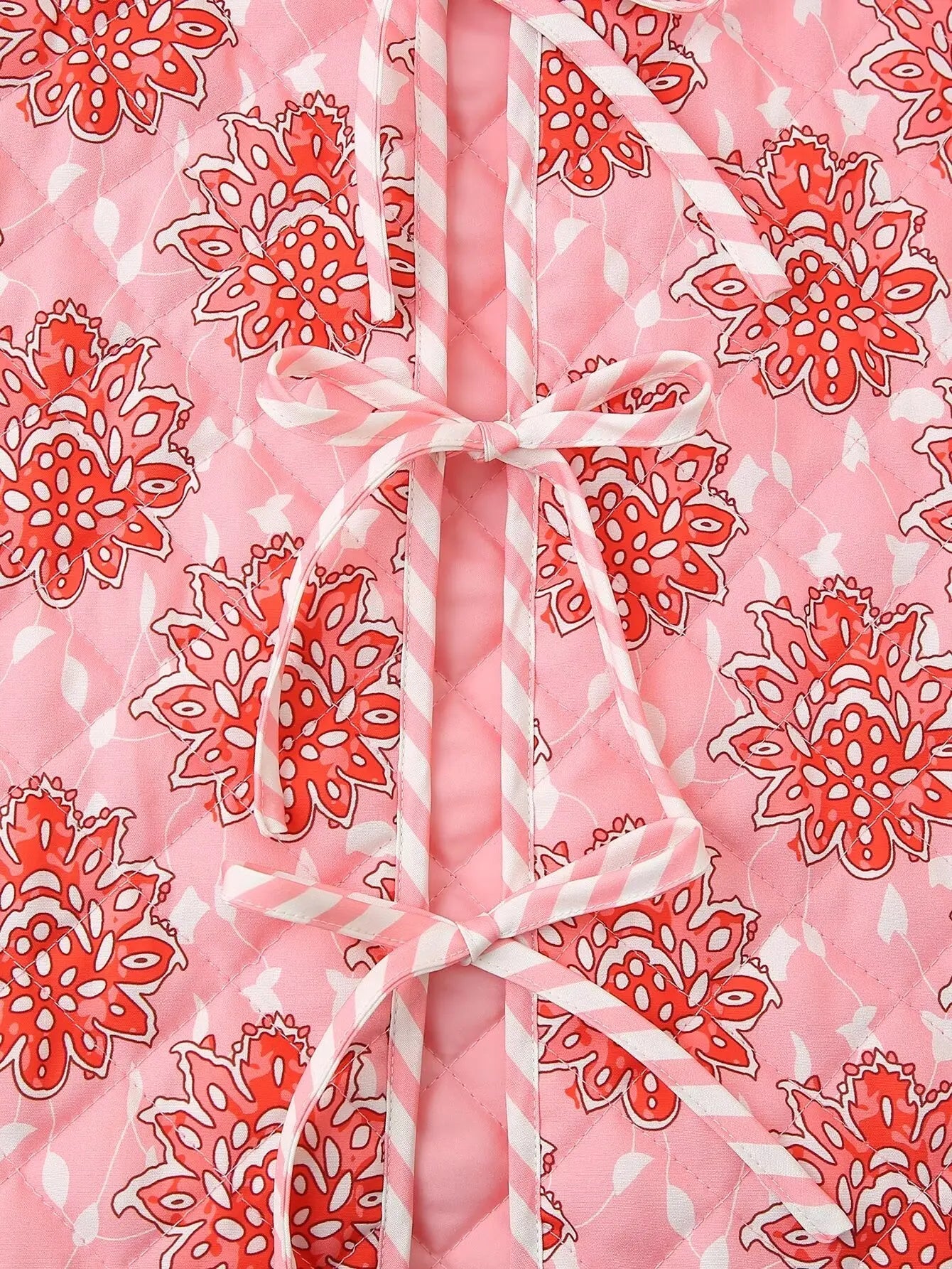 This floral printed quilted vest is such a fun piece to add to your closet. Very cute for layering, giving you so many options on how to style. Lace up the bows and wear it as a lightweight top or throw it on top of your favorite sweater or button up.